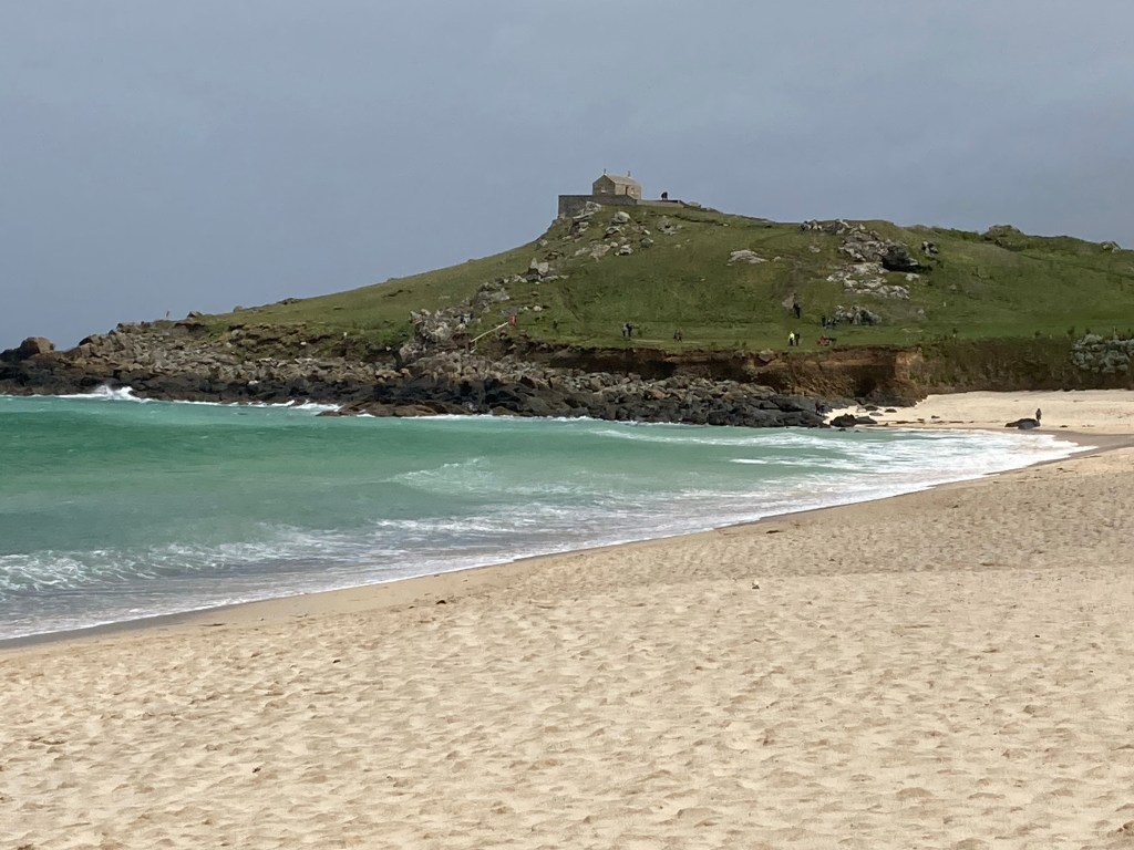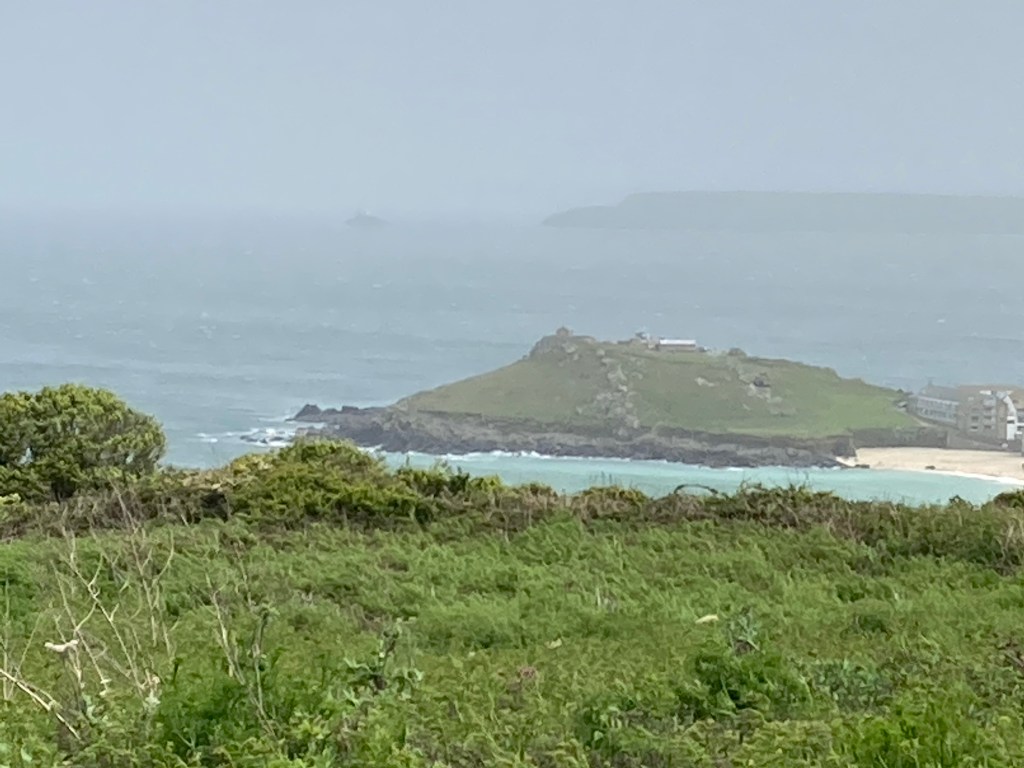 There were several things about St Ives. The light really is different. I think it’s because the town (the old part) is on a narrow spit of land with water on both sides and a white sand beach both of which reflect back the light. The second thing about St Ives was the people. Lots of people. It felt very odd to be in a crowd. The third thing is that I am staying in Carbis Bay which is another couple of miles down the coast. The coast path takes a traffic-free route past more white sand beaches, past the G7 summit hotel (lots of fence putting up activity, and notices about the path closure for the duration) and eventually to a very nice cafe (decaf latte and a gluten-free carrot cake) about a minute’s walk from my Airbnb.