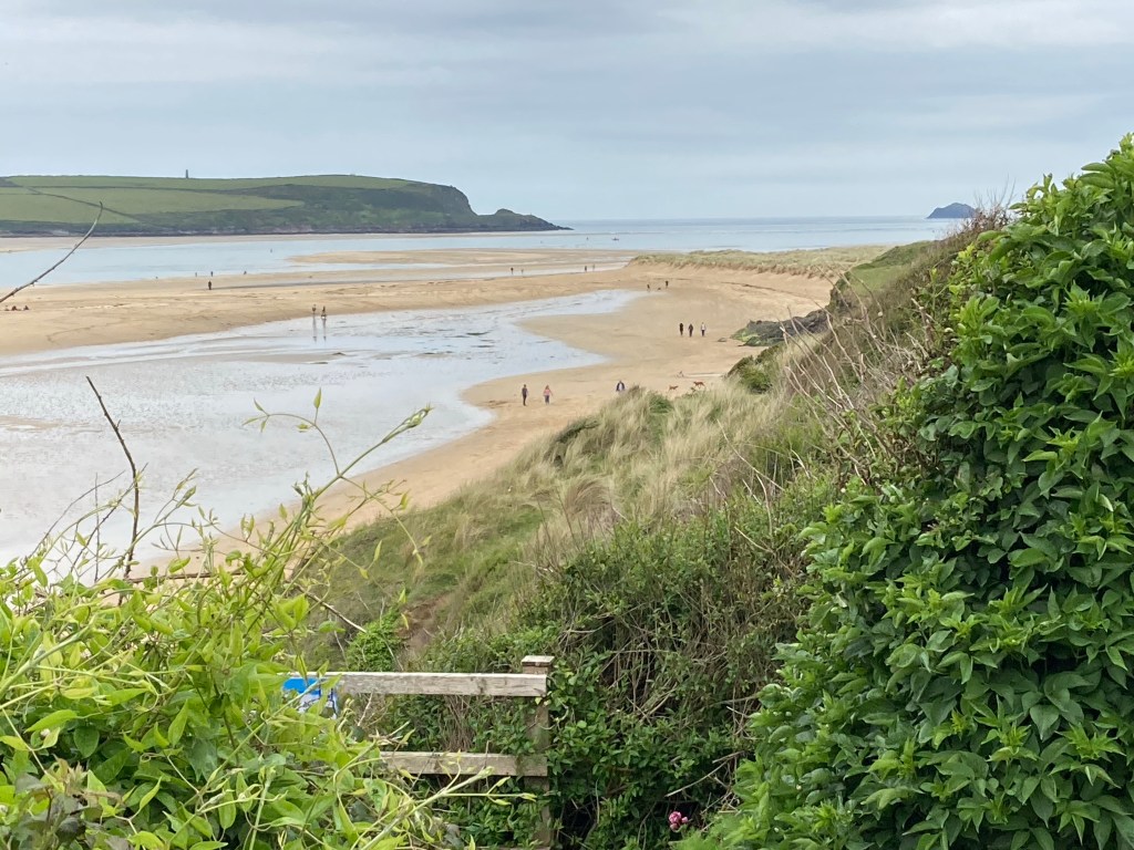 But first, there was work to be done. The rain had stopped so I packed up my wet tent and walked into Padstow to buy lunch. Lunch procured, I caught the ferry (£3.00 fare), and walked uphill to meet Chloe and Ollie who were staying with Ollie’s parents. Chloe is quite heavily pregnant so, after catching up on other matters we had a happy time discussing babies. Well-breakfasted (shakshuka, Chloe is an excellent cook) electrics fully charged, I set off at midday for Port Isaac. My guidebook told me I had 11.5 miles to go. It also told me that “there are a few steep-sided valleys” between Port Quin and Port Isaac “but they are not too difficult”. For the first few miles I made good time, I enjoyed the views of the Camel estuary, and watched the people surfing.