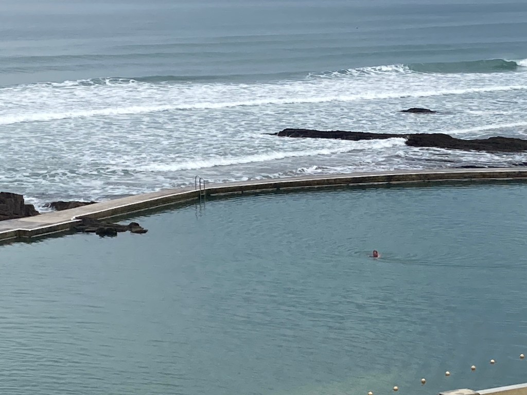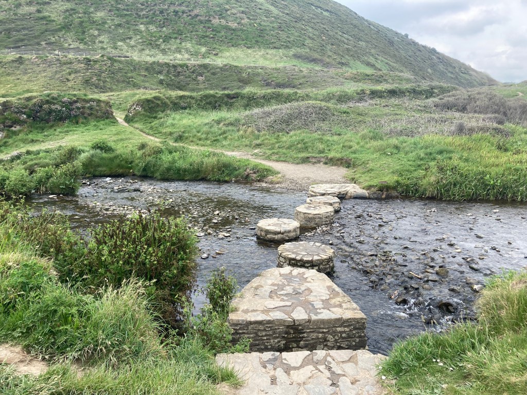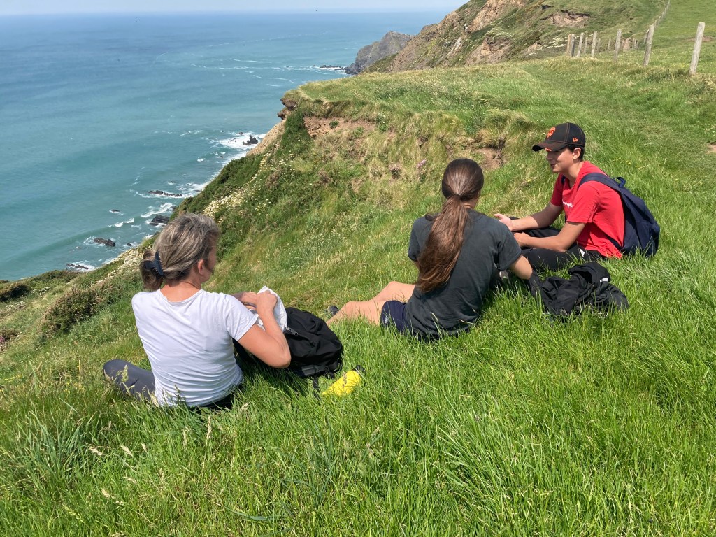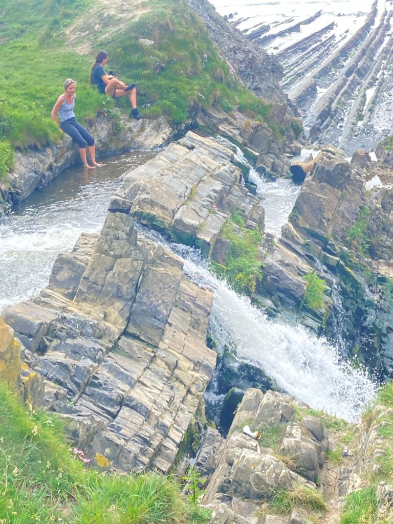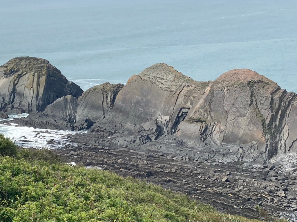 We left Bude well-stocked with pasties (Karen and her children had two each) carrying plenty of water. It was raining but not heavily. We passed the rock swimming pool which looked different with the tide in. We passed a couple of cafes, we were feeling carefree. Until the ups and downs started. And went on, and on, like yesterday, except there were more of them