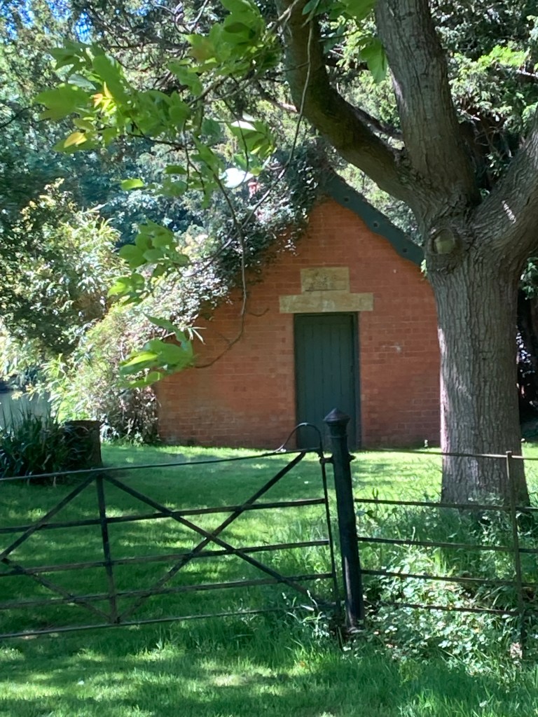 We backtracked and carried on along the road to Spaxton and, despite our two previous footpath failures, decided to try again. This time we were lucky. It wasn’t immediately clear that we would be. Yes, it was signposted from the road but there was no path across the ploughed field. Gamely we headed for the stream and eventually found a bridge -not before we had jumped the stream -and a path. The path continued until it became a nicely mown path past a lake, a castle and a ice house. I’ve got a photo of the ice house but not the castle which is really a 19th century house with a tower.