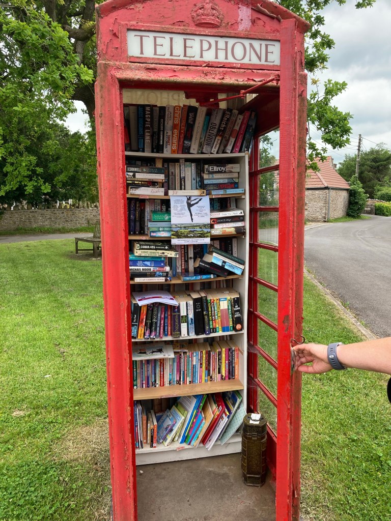 Library in a phone box, door held ajar by Sue so that you can see the books more clearly.