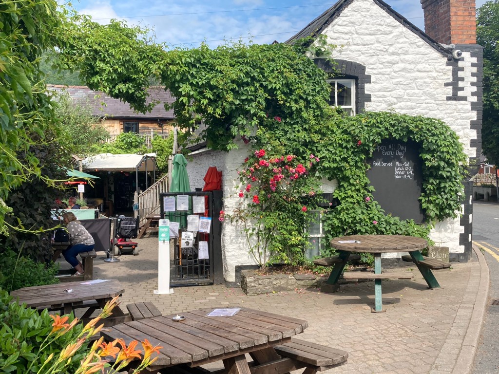 I’m staying at the Horse and Jockey, a pretty pub in town. My friend Helen was due to meet me from the train at 7.15 and while I was waiting for her on the pavement outside the pub, who should turn up but Damian who had taken a day trip (on the train) to Shrewsbury. He had dinner with us but tomorrow is heading out on the Heart of Wales Way, taking a different route to the Pennines.