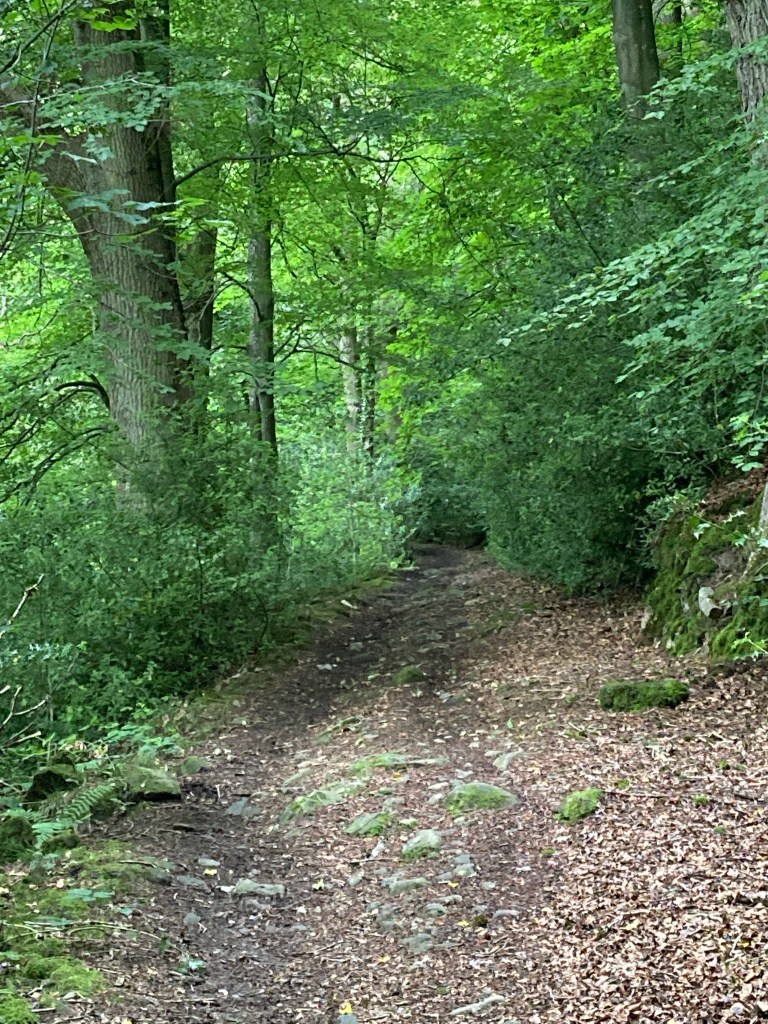 You will not be surprised to learn that the path now went very steeply down for quite some time, still following the Dyke. It was a narrow path booby-trapped with large holes and tree roots. We went through a field of ponies, some eager to see if we had any pony-suitable food. We didn’t, and anyway, even if ponies like date and walnut cake they weren’t being offered any. We were chased by geese. Feeling a bit fed up of being chased by domesticated livestock by now.