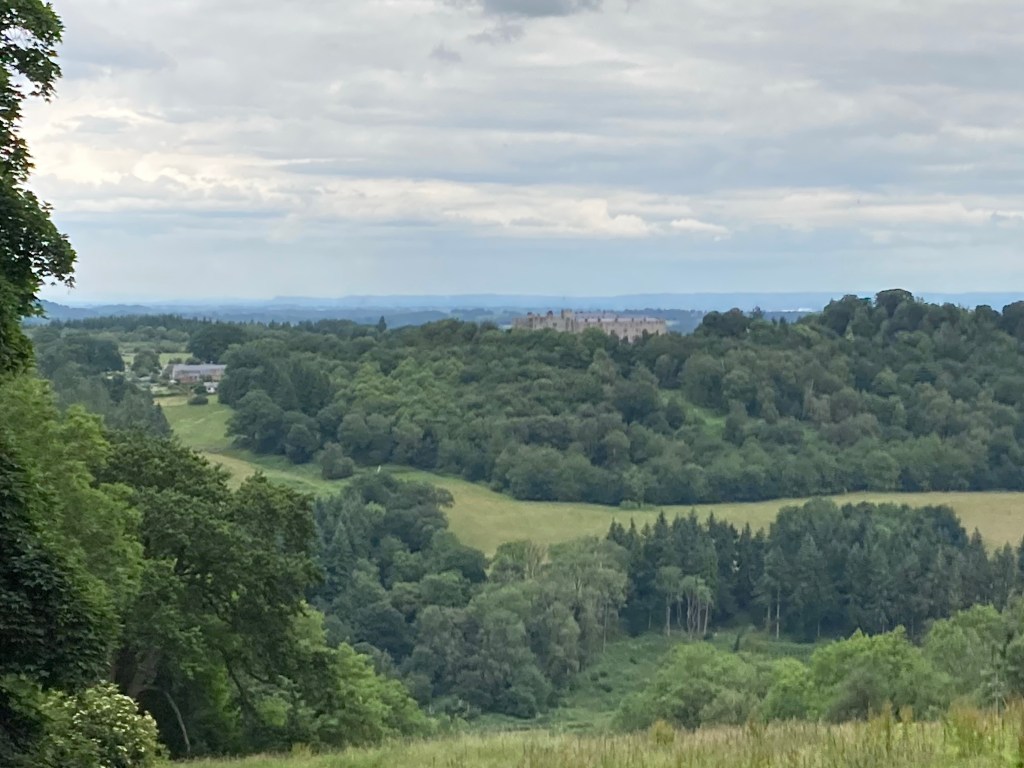 We made good time. The racecourse was easy to walk on and then the path took to a road for quite some time. We turned off the road, and skirted round another hill along a green lane. No brushes with cows today, although lots of sheep. The path returned to the Dyke and we followed it for some time until suddenly we could see Chirk Castle through the trees.