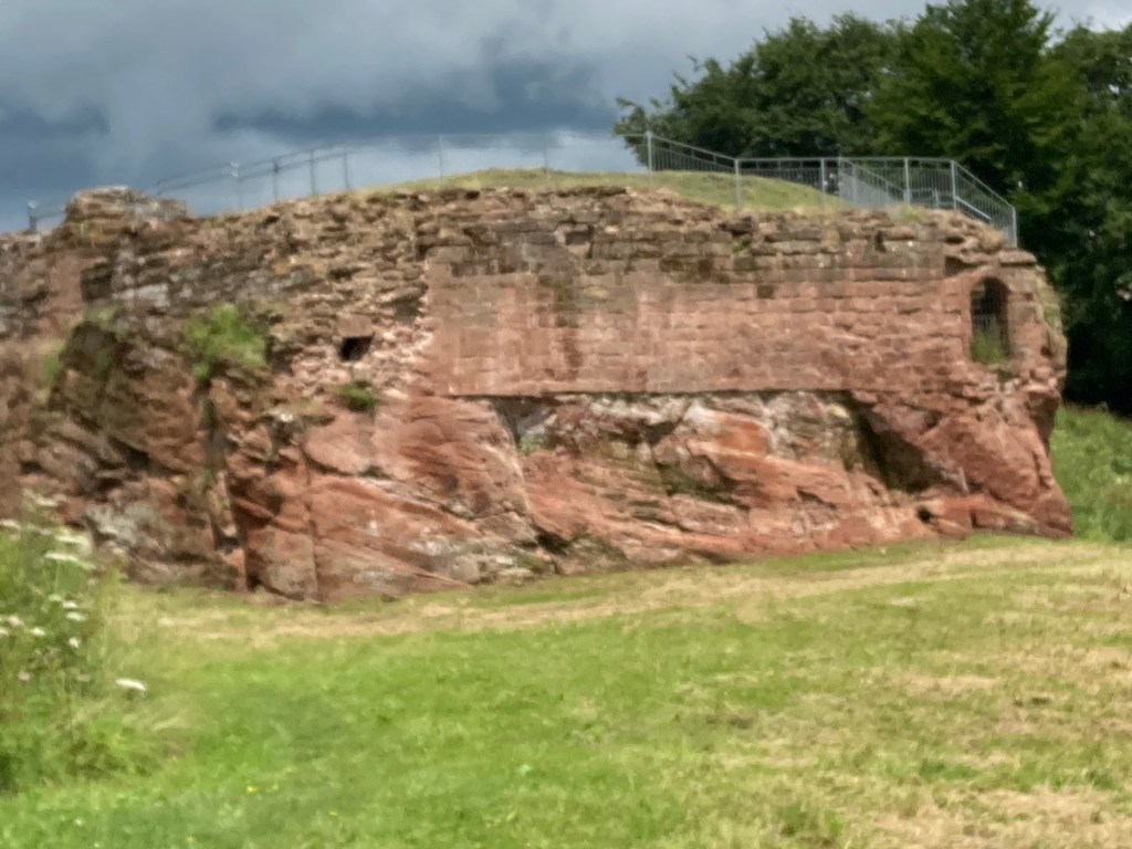 Immensely cheered by this meeting I carried on with a spring in my step. I walked along beside a stream, passed under the Holt/Farndon bypass into an area with picnic benches, mown paths, and a castle.