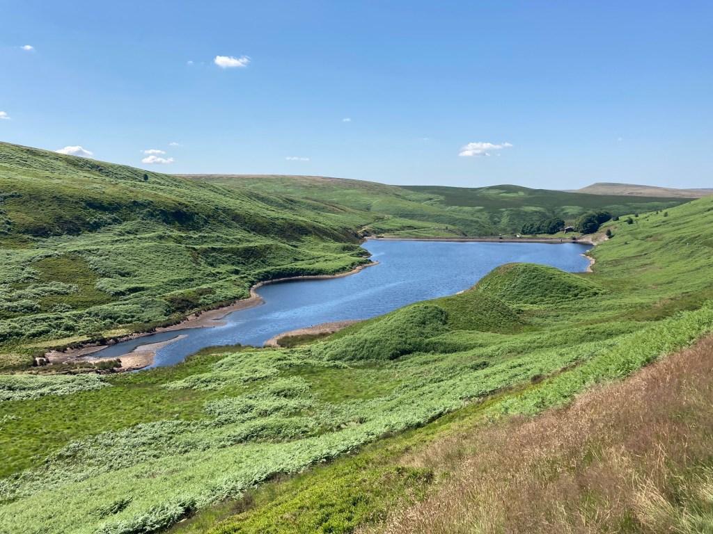 We set off along the reservoir (James from the B and B had told us the first three hours were the worst, he’d also told us of an alternative path that skipped a steep climb) before the path turned uphill. Unfortunately, having never forgotten my walking poles until this morning I forgot them again after stopping to tighten my shoelaces. As a result we found ourselves behind a large group of walkers. It felt rather like being behind slow traffic on a narrow road with no opportunity to overtake. After a while they moved aside with cries of “Speedy walkers coming through”, which put quite a lot of pressure on us to stride briskly up the hill in an attempt to maintain that fiction. Fiction on my part-Karen is a very speedy walker. And certainly not a hot, sweaty, breathless and red-faced one.