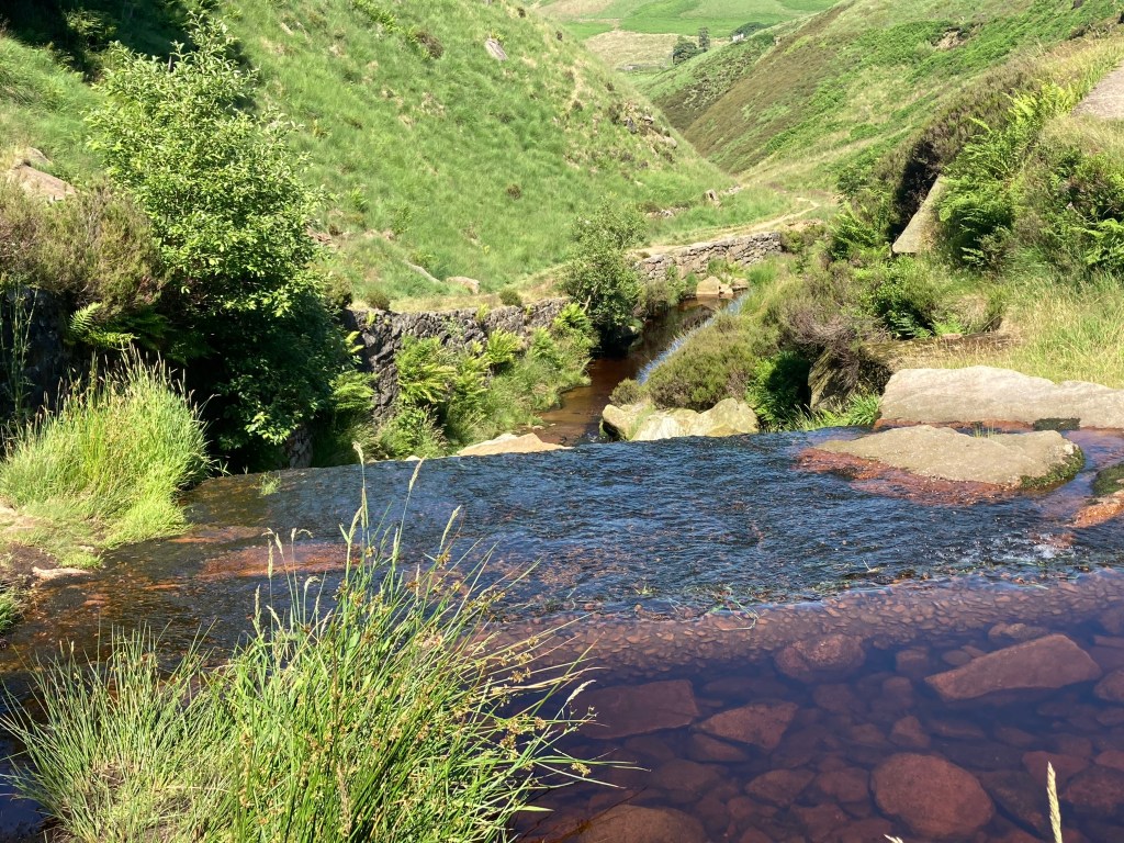 After this highlight, the path was dull, and it has to be said, boring. We couldn’t wait for it to be over. It was also very hot. Once again I took off my shirt and this time, dunked it until it was soaking wet. It was great until it dried out- all too quickly. We knew we were getting close to the point where we left the Pennine Way to turn off to Diggle where we are staying. A family came towards us, and the little boy had an ice pop. Karen asked where he’d got the ice pop, hoping she would find there was an ice cream van. There wasn’t, they had brought them from home. And then the dad offered us each one. They were still well frozen, and just what we needed to keep our spirits up.