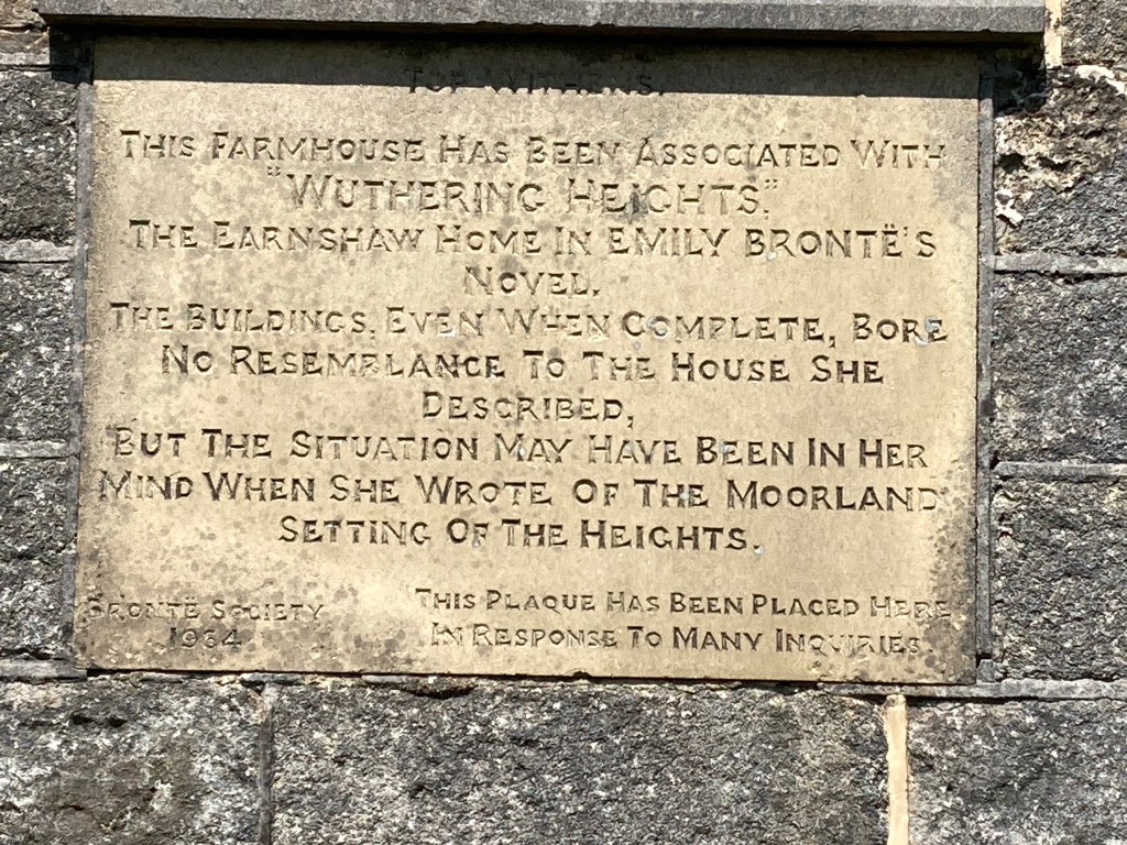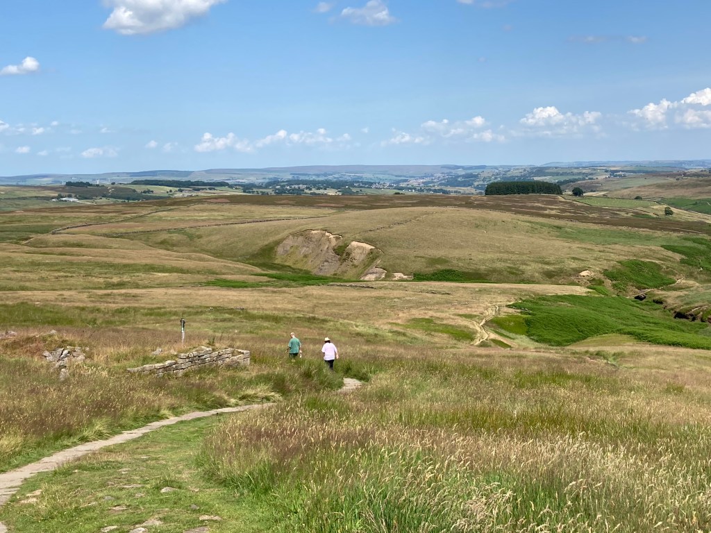 The path took me up and over the moor, and due to a lack of attention on my part I missed the pub. I carried on up a long track to a reservoir and was startled suddenly to find a man behind me. He told me he had been having his lunch in the shade of a rock when I went past. He was on holiday in Keighley and was doing a day walk. We chatted for a bit, around two shadeless, hot reservoirs, and up and over another hill-mostly on a flagstone path. He pointed out the Lancashire Yorkshire border but at Top Withens (Withins? Can’t remember) I stopped for a late lunch and he carried on.