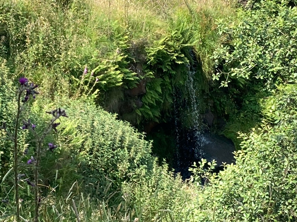 I came down from the moorland to farmland. At one point the path was diverted round a newly-built, or newly-renovated house and it’s garden. I took the opportunity to sample some of their black currants. (Only two). Delicious and quite different from the blaeberries I have been snacking on over the last few days. We learnt as children to call them blaeberries-bilberries to most of you. They do tend to stain one’s hands though.