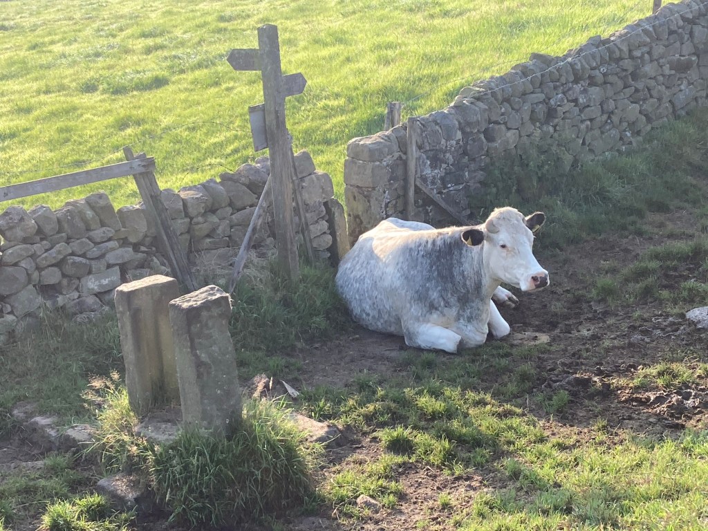 I managed to shimmy through the first stile only to find more of a challenge with Daisy. I don’t think she’s really called Daisy, she didn’t seem to respond to the name but I stuck with it, although was tempted to try Buttercup. I tried a gate-too wobbly to climb but there was a gap between it and the barbed wire on the wall where I could manoeuvre the backpack and leave it resting until I could get past Daisy (see photo below). I called to her. I reasoned with her but she didn’t move for quite some time. Eventually she staggered to her feet amd I slipped behind her, egged on by a woman who was walking her dogs. Getting the backpack a) down from the wall without snagging it in the barbed wire and b) back on my back was tricky. I felt disgruntled. Still, chin up, I headed off, across the field and up the road.
