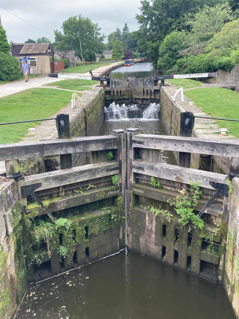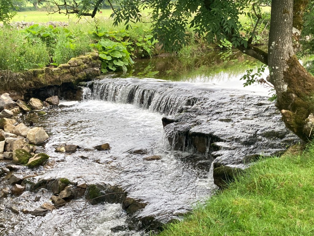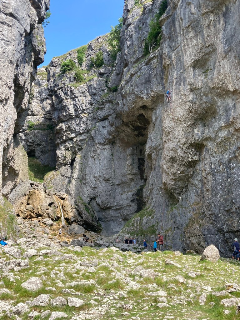 The Scar is a small gorge, with a waterfall and sheer walls where climbers gathered. The notice board was full of the magnificence of the Scar but I think I’ve been spoiled both by TV programmes about natural wonders and by seeing other limestone areas. It was OK. Was it worth a, by now, rather hot walk? Not sure. It was fun to watch the climbers though.