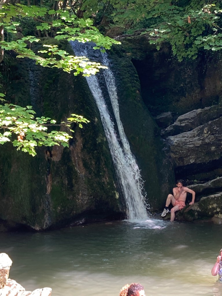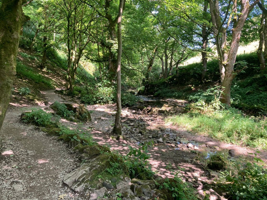 As I had nothing to do all afternoon, I decided to visit Janet’s Foss (foss=force=waterfall). There were a lot of people heading that way, firstly along a flat white (local limestone chippings) path, then through a beautifully cool, wooded area until I reached the waterfall. There were quite a lot of people there, swimming and generally having fun in the pool beneath the waterfall. Legend has it that Jennet (or Janet) queen of the fairies lives behind the waterfall but there was no sign of her or of a cave that she might inhabit. I climbed up above the waterfall-I say climbed, it was a stepped path that led up the side – and carried on, away from the cool wooded area along another white path (and a road) to the stream that came from Gordale Scar.