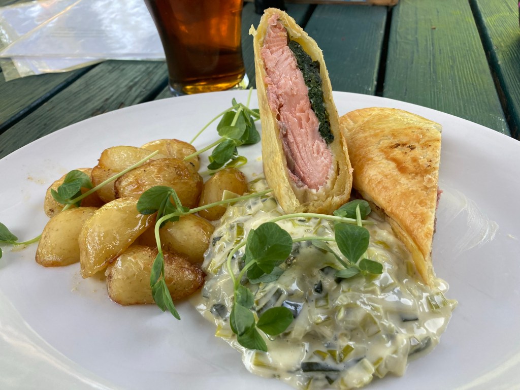 You will have realised by now that my afternoon was a little on the dull side. As soon as was decent, I headed to the pub for dinner. All outside tables full. I went inside to see if the barman could suggest a cunning strategy. No, but looking out of the window behind me he thought someone was about to leave so I should grab that table. I did. I had a pleasant, leisurely -after all, there was nothing to do once I’d finished-meal of Salmon Wellington, leeks and new potatoes. My pudding was an apple back at the tent. I settled down and read for a while before having an early night.