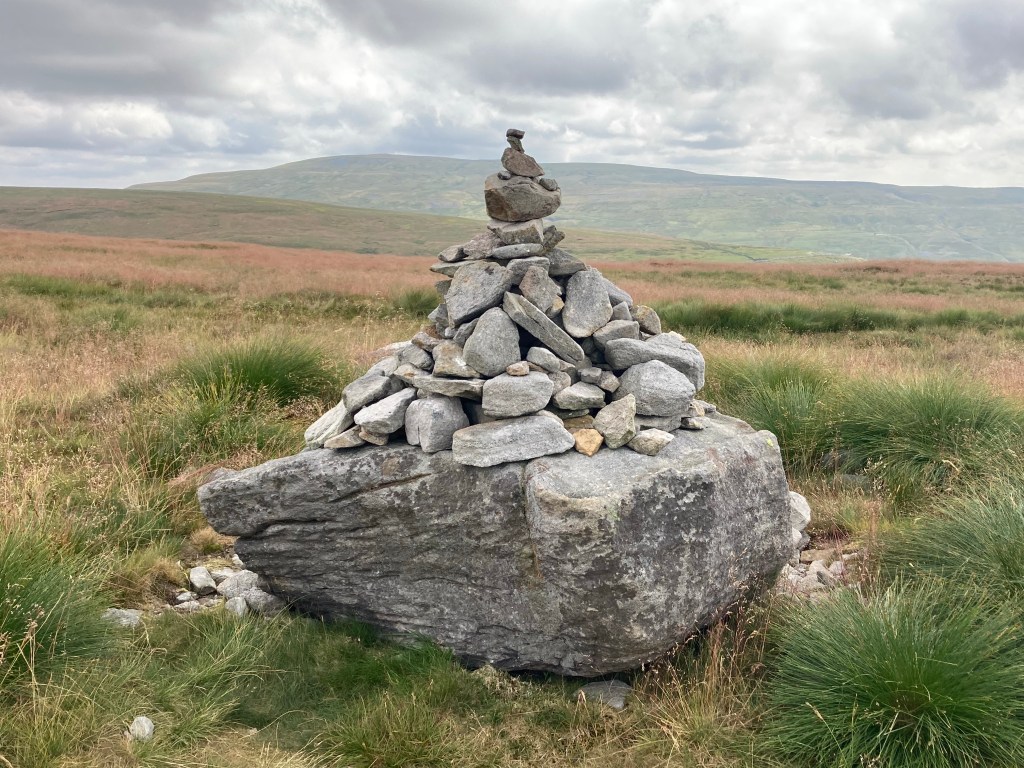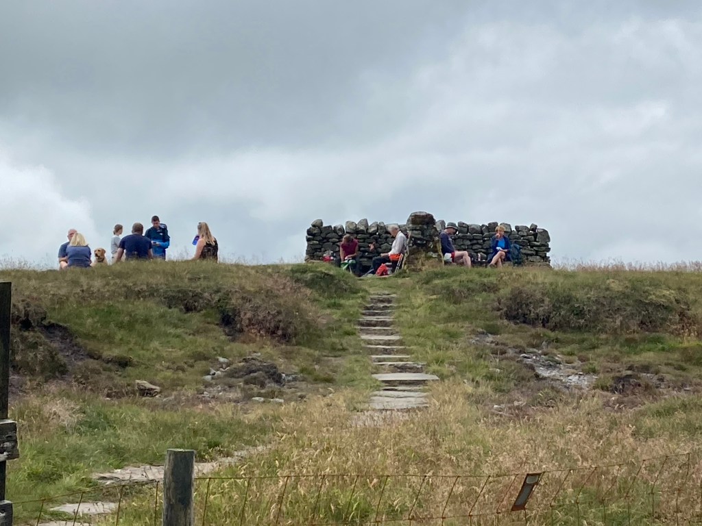 They helped us keep our speed up until we reached Great Shunner Fell, 716 metres above sea level. There is a cross-shaped cairn at the top, with seats, but it was pretty full with a lot of people having lunch. It turns out that walking to the top is a popular day walk which explains the number of people.