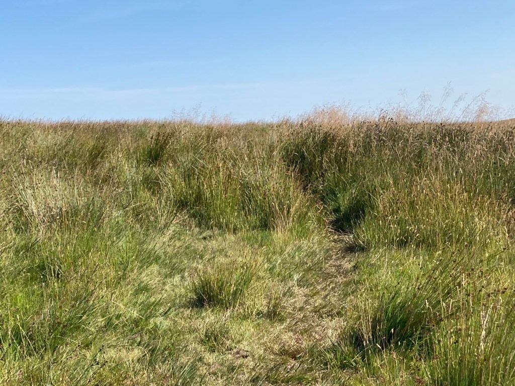 Today there were midges. There was low cloud and the morning was absolutely still. I lay in my tent trying to summon the energy to get up when I noticed that outside my tent, but under the fly sheet, there were a lot of midges flying about. Time for the midge net, and the midge repellent (Smidge, there being no Avon Skin so Soft) I had bought both in Alston after the trauma of the midge attack at the Tan Hill Inn. I donned my midge net over my hat, applied Smidge to as much of my body as I could reach and braved the outdoors.