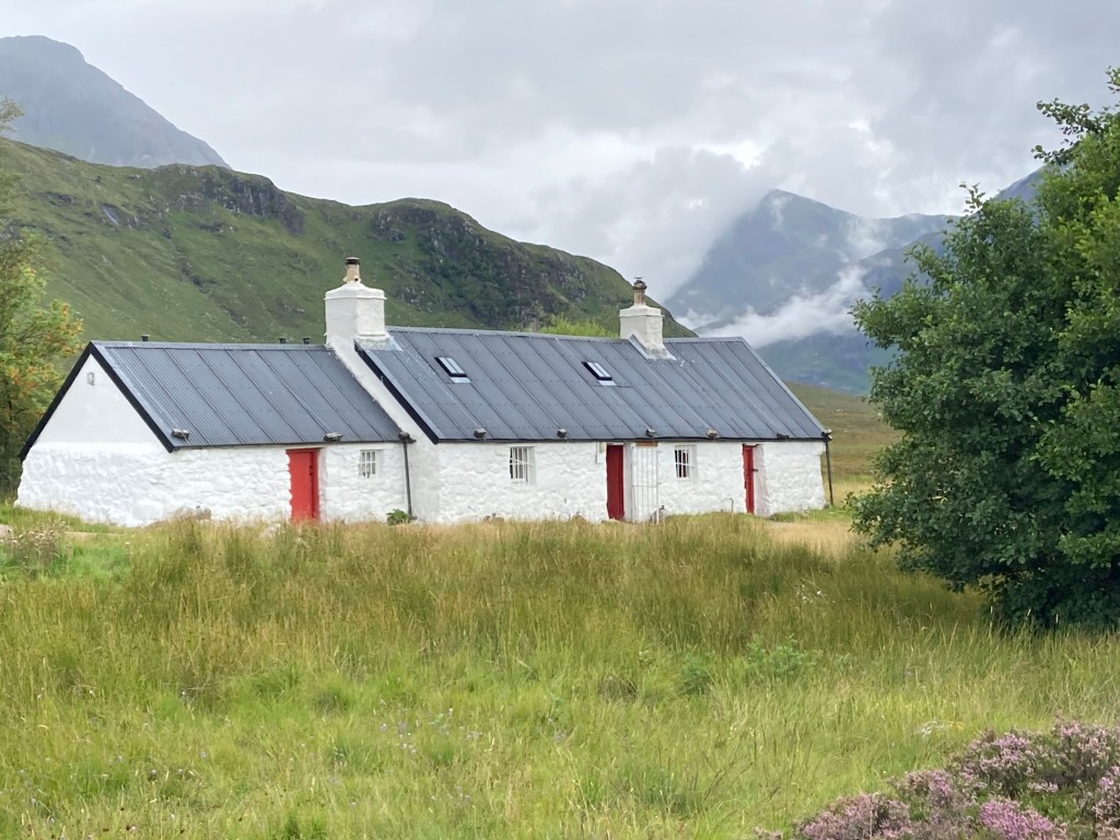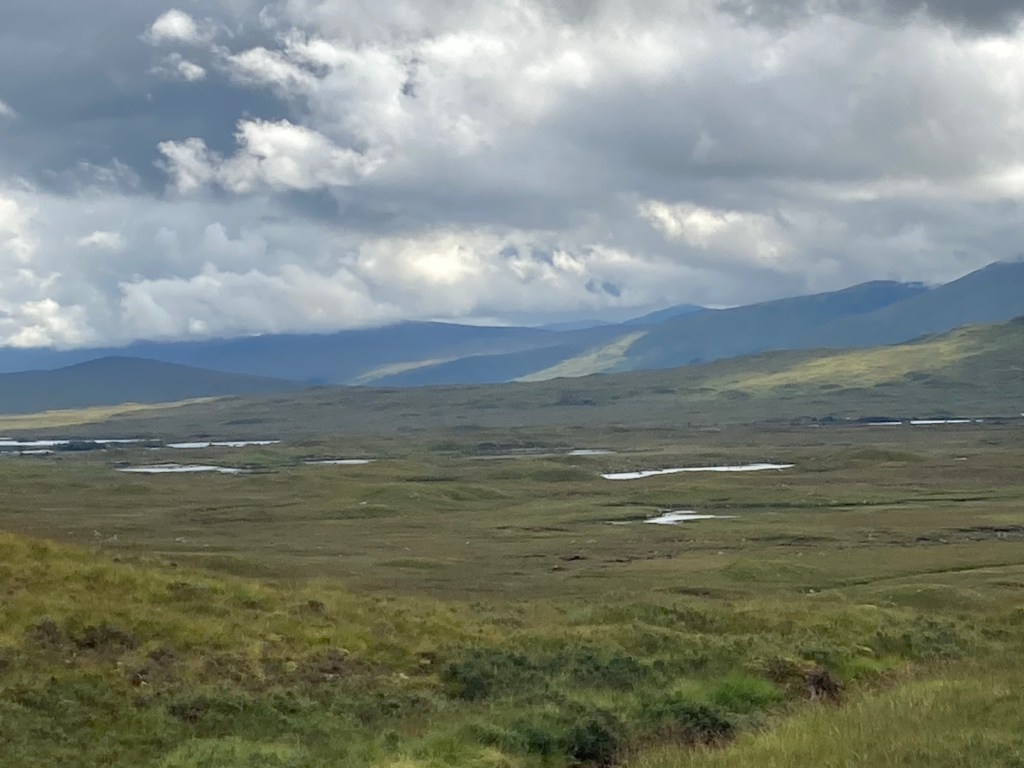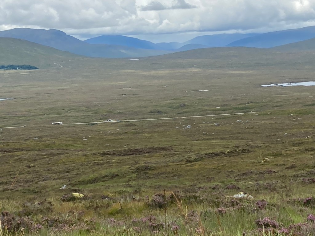 What with the easy path, the lack of gates and stiles, and our hearty breakfast we were halfway before we knew it and decided we had better slow down or we would be sitting outside the Kingshouse Bunkhouse for some time before our room was ready. We sat on a bridge parapet, aiming to spend an hour or so there. We had, unfortunately, forgotten about the midges. Despite being covered in a layer of Smidge midge repellent, we were still a source of attraction for the wee beasties (only been in Scotland for a couple of weeks and already lapsing into the vernacular). Our plans for a long elevenses were rapidly altered, and we set off again, aiming to amble along slowly (midges only get you when you’re stationary). We were, it has to be said, overtaken by a lot of people. We chatted to Simon who I had first met climbing Conic Hill and some other people. It was a busy day today with a lot of walkers out. It was an amazing walk, it felt remote but not as much as the day out of Byrness. I think that was because there was a good path rather than just a track through the bog. And of course, the A82 was occasionally visible in the far distance. The mountains surrounded us and the wreaths of cloud made it all feel very dramatic.