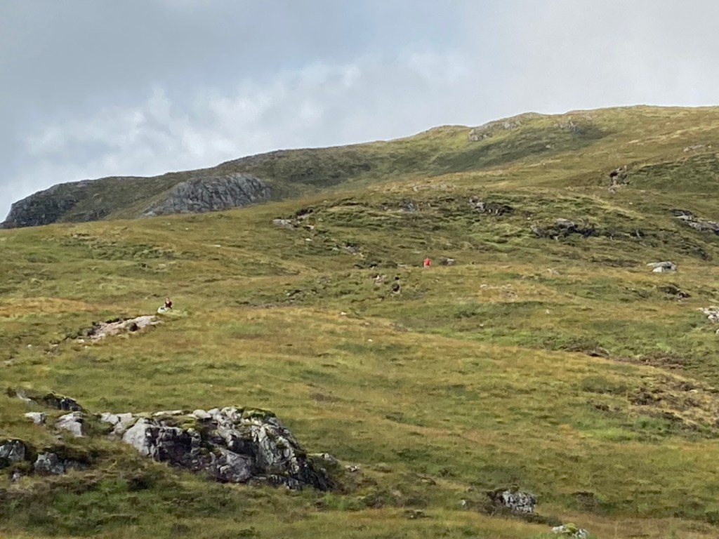 The cloud lifted as we climbed. The military road didn’t go right to the top of the hill but passed through a saddle. There we met the two students (James-ancient history – and Daniel -biology) from our night at Inveroran, who we’d also seen at the Kingshouse where they were camping, and Simon, who had just finished an early lunch. Long distance paths are quite sociable. Matthew, who finds it difficult to resist hills, climbed to the top of what I think is Stob Mhic Martuin (707m) while I listened to a podcast (More or Less in case you’re wondering,)