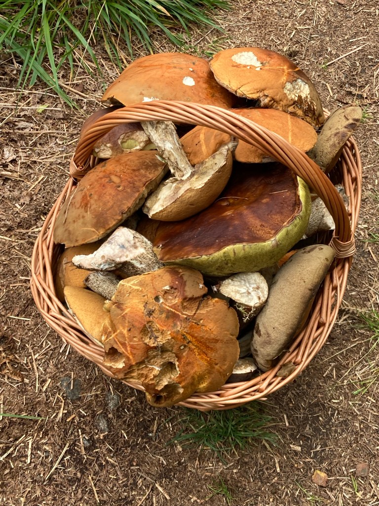 Basket of mushrooms. The brown ones at the top are birch mushrooms (that’s a translation from Czech, I don’t know if we call them that) and the big yellowish upside down one is a cepe.