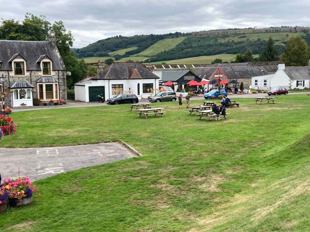 Just before descending into Drumnadrochit we detoured off the road. It wasn’t the best of detours, the track became a stony road with loose stones followed by a long boring walk through Lewiston, past the school (it might have been Bank Holiday Monday elsewhere in the UK but not in Scotland), the petrol station and the Co-op. Were we there yet? No. Eventually we arrived at the rather pretty green and made for the Ness Deli where we sat outside and had our lunch.