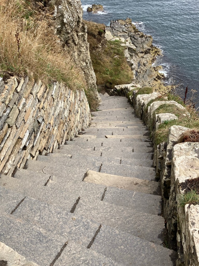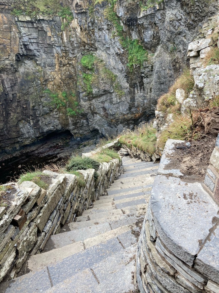 I almost missed the turn to Whaligoe as it wasn’t signposted. Whaligoe Haven is a small harbour which was improved at some point in the late eighteenth century so that ships could unload salt and herrings for curing. There are over 300 steps down to the harbour. They have been closed for a while but re-opened about six weeks ago and the mason was there today carrying in with his work. I didn’t go to the bottom but did go part of the way.